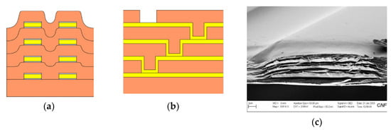 (a,b) Schematic cross section of a four-layer, flexible microfabricated lead structure for a multi-electrode array in which the separate, insulated 0.05 μm Ti/1.5 μm Au/0.05 μm Ti metal traces (light color) are separated by HD Microsystems PI-2611 polyimide layers (not to scale) and interconnected with metalized via holes; (c) SEM micrograph of a cross section of an as-fabricated structure of this type; as the number of metal layers increased, step coverage over previously patterned traces with photoresist became increasingly difficult, to the point where the use of >4 such layers introduced too many process defects [30]. Multiple layers permit the width of a high-density multi-electrode array to be reduced, and also permit crossing signals over from one layer to another.