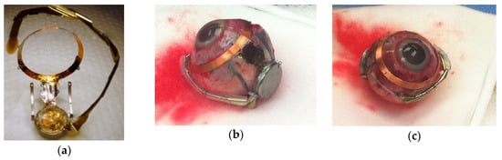 Photographs of the implanted components of our prosthesis. (a) A previous-generation coiled-cable electrode array that accommodated a variable distance between the implanted neuro-stimulator package and the insertion site into the sub-retinal space. A flexible, 12 μm-thick array is helically wound around a medical grade silicone tube; (b,c) The same generation device is shown implanted around a human cadaver eye after its enucleation. Note, the eye shrinks in size post mortem, thus the prosthesis fit in this example is not exemplary of what the appearance of the fit would be for a living subject that had the same ocular size pre-operatively.