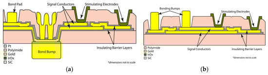 Given the channel count desired for our design, then, it was concluded that for a high-density retinal prosthetic, the large number of independent sites involved required that the leads be printed on multiple layers of metal. Each layer of conductors required inorganic encapsulation above and below the metal traces to insulate them from one another, which also increased the overall required silicon carbide thickness and thus, the stiffness of the multi-electrode arrays. We also studied the feasibility of increasing the number of layers of conducting traces to as many as 4, which would be required in the case of very high channel counts unless a distributed system involving the use of signal multiplexing and de-multiplexing were employed. In Figure 3, test structures and cross sections of sample four-layer devices that were fabricated are shown [30]. The electrode arrays shown in Figure 1, however, were fabricated with just two layers of conductors, again using vias between the layers; this process is outlined in Table 3. Using two layers of traces, we were able to accommodate twice the channel count in the same electrode array width, and we were also able to “cross over” or under a trace on an adjacent layer by creating conductive vias between the layers on either side of the area that was desired to pass beneath (or over).