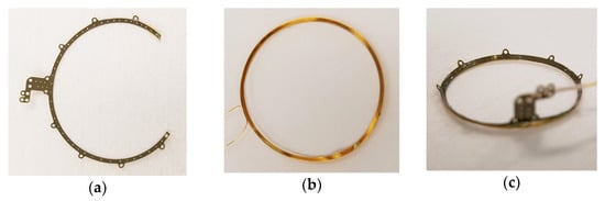 Microfabricated supporting structure for supporting and suturing a 19 mm diameter wire wound secondary radio frequency coil around the cornea (see also Figure 1). (a) A base layer of HD Microsystems PI-2611 polyimide was applied to a host Si wafer, electroplated Au was added to mechanically reinforce the structure, and the support perimeter and suture holes were etched by O2 RIE; (b) An Au wire coil wound on a spherical form so that it would lay flat on the sclera surface; (c) The assembled coil support with an incoming silicone tube to protect the coil wires from handling and to allow flexibility of coil placement relative to the electronics package.