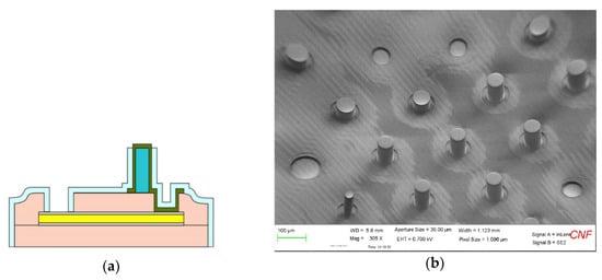 (a) A cross section diagram of a flexible, microfabricated electrode array with a penetrating post formed from photo-imageable SU-8 epoxy (in dark blue) whose sidewall is insulated with Parylene-C (light blue). The fabrication process is similar to the planar electrode steps of Table 3, except that the SU-8 films are patterned prior to the SIROF deposition and liftoff, and Parylene-C coating; (b) A SEM micrograph of a completed, hybrid penetrating- and planar-electrode array, containing posts that are either 50 or 100 μm-tall (two separate 50 μm layers of SU-8 were applied).