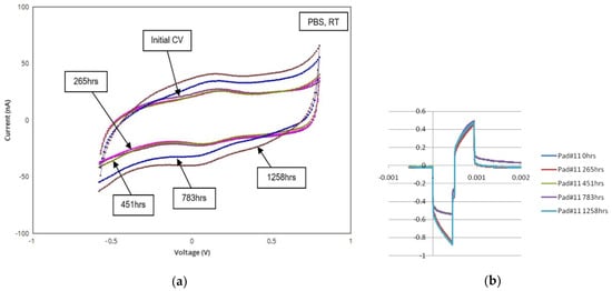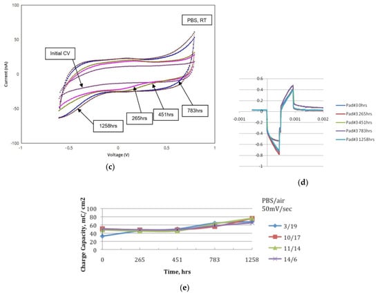 The expansion of the charge capacity and enclosed area in the voltammograms are typical of SIROF electrodes with repeated cycling in saline solution, and this outcome was similar for both planar- and penetrating-electrodes. The changes to the electrode voltage waveforms upon repeated bi-phasic current pulsing can also be seen. The differences are attributed to hydration of the SIROF films and expansion of the effective surface area of the sites from the films’ as-deposited state. This feature is best taken into account when “burning in” a new electrode array on the bench top prior to implantation, for example. Platinum electrodes deposited by conventional physical vapor deposition processes, which we fabricated in the early years of our team’s device evolution, did not require such treatment. SIROF charge capacity was also found to continue to increase even after more than 1000 hrs of continuous pulsing, indicating that the beneficial effect of exercising the electrodes in saline environments continues beyond an initial break-in period.