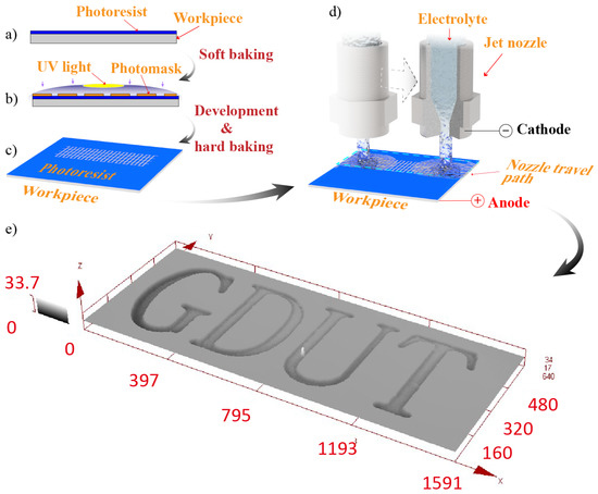 - Mask electrolyte jet machiningThe electrochemical cell consisting of workpiece with patterned photoresist (anode) and an electrolyte nozzle (cathode) is activated. The electrolyte nozzle travels back and forth over the workpiece surface with a given velocity and in a certain crossing path, and electrochemical reactions and material dissolutions take place selectively (Figure 1d);