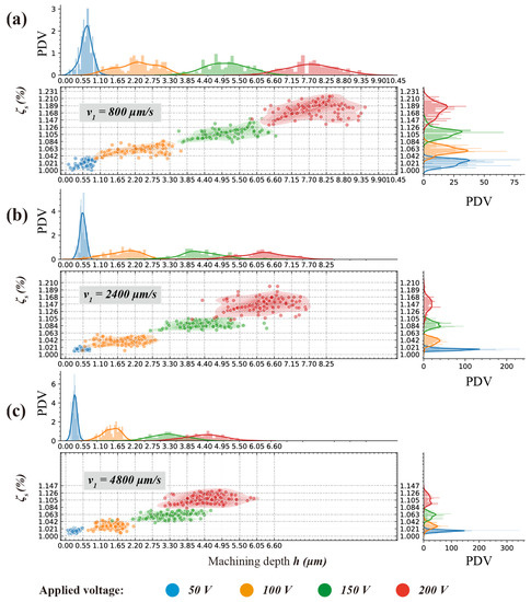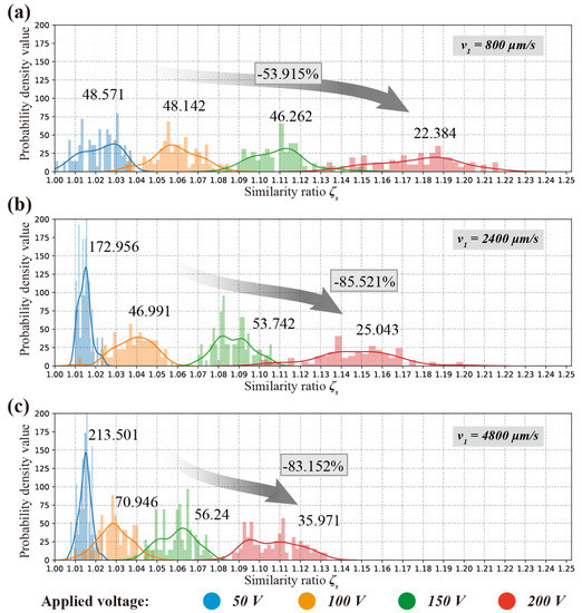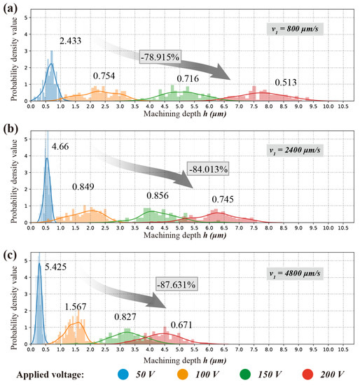 - by analyzing the distribution of experimental results, faster nozzle speed suggests less mask failure possibility hence beneficial for improving shape accuracy. For applied voltage of U = 50 V, with the nozzle speed decreased from 2400 m/s to 800 m/s, the probability density value of similarity ratio decreased by 71.917%, where as the value of machining depth decreased by 47.790%.