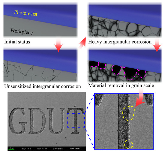 - intergranular corrosionIn case of stainless steel (depending on heat treatment), the susceptibility to intergranular corrosion can lead to non-uniform dissolution thereby deteriorating shape uniformity as illustrated in Figure 9. This phenomenon can be steady decline by pulse power supply [34] and will be investigated in future works.