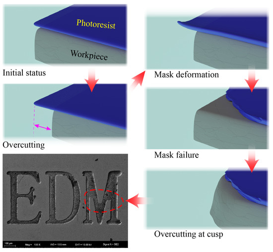 - mask failureThe thin masks are prone to deformation, failure and delamination due to electrolyte flow field and machining conditions as illustrated in Figure 10. This can lead to increased overcut and deterioration of shape accuracy. This issue can be conveniently addressed by employing a thicker mask.