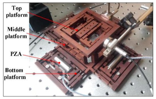 The compliant positioning platform driven by a piezoelectric actuator (PZA) is widely used in aerospace technology, Microelectronics Mechanical Systems (MEMS), biomedical engineering, optical engineering, and other modern precision engineering fields [,], taking advantage of the advantages of a PZA, such as the ultra-high displacement resolution, high-frequency response, and large output force [,], as well as the characteristics of a flexible hinge, such as high precision, fast response, and compact structure [,].