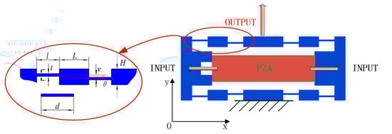 Compared with other types of amplification mechanisms, such as lever amplifiers, rhombic amplifiers, and Scott–Russell amplifiers, the bridge-type amplifier with a compact structure and large displacement amplification ratio is extensively adopted in engineering applications. The principle and relevant parameters of the bridge-type amplifier are shown in Figure 2. The input displacement and input force generated by the PZA in the X direction produced an amplified output displacement on the Y-axis. The hinge length is l, the thickness is t, the length of the connecting beam is L, the height is H, the angle between flexible hinges is θ, the spacing is v, and the mechanism’s width is d.