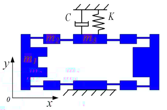 As shown in Figure 3, the mass of the left and right rigid beams are m1, the mass of the four connecting beams is m2, and the mass of the intermediate output beam and the lower fixed beam is m3; therefore, the system kinetic energy can be calculated as:
