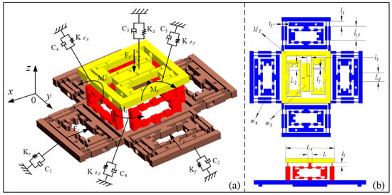 As shown in Figure 4, the entire structure of the compliant platform of this study was connected with a flexible hinge. In addition to the bridge-type amplifiers described in chapter 2.2, the bottom platform included the double four-bar guiding mechanism to prevent displacement coupling. Compared with the mechanism of the single-bridge approach [], the proposed symmetrical and bidirectional structure effectively prevented large, coupled displacements. The platform dynamics model diagram is shown in Figure 4a, and the related parameters are shown in Figure 4b. The Lagrange equation was used to derive the dynamic model of the platform.