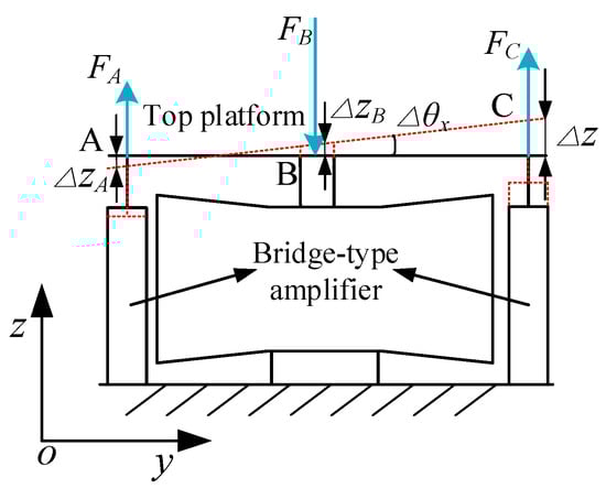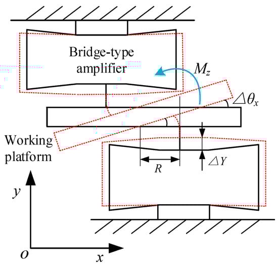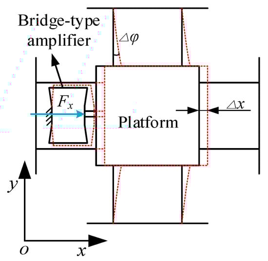 Due to the symmetrical structure of the platform, the rotation of the platform about the Y-direction is the same as the X-direction. As shown in Figure 7, when the right bridge-type amplifier is driven by the PZA, the platform has a rotation angle Δθx around the X-axis. At this point, the left bridge-type amplifier will be compressed, and the middle two will be stretched. According to the balance of forces, the following relation is obtained: