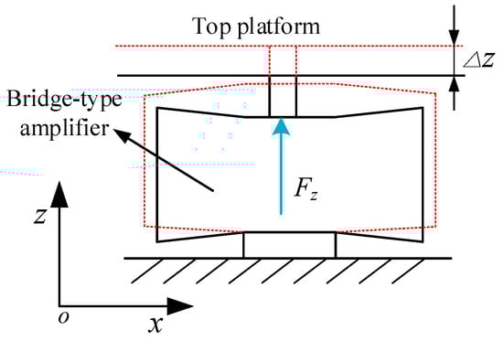 As shown in Figure 6, when the platform is displaced by Δz in the Z-direction, the middle four bridge-type amplifiers and the entire top platform are displaced. The kinetic energy of the system includes the kinetic energy of the entire upper platform and the kinetic energy of the four bridge amplifiers, which can be expressed as: