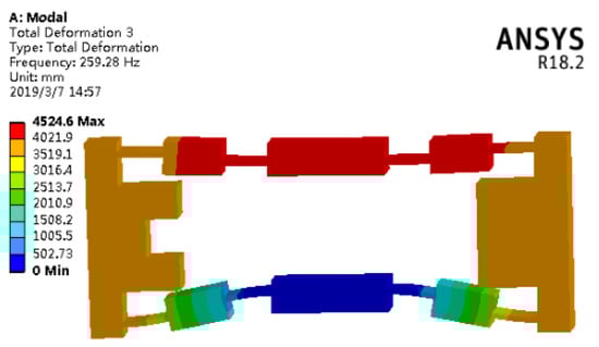 Since only the translation along the Y direction is considered in the generalized coordinates of the analytical model, according to the vibration mode analysis, that was the third-order mode of the bridge mechanism. The third-order mode shape of the bridge-type amplifier is shown in Figure 9. It is easy to find that the FEA value of natural frequency was 259.28 Hz. Compared with the theoretical value of the natural frequency, 266.95 Hz, the error was only 2.96%, which fully proves the accuracy of the analytical model in this paper.