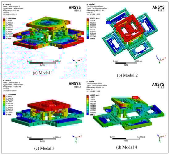 Modals of the finite element analysis (FEA). (a) The modal 1 of the platform; (b) the modal 2 of the platform; (c) the modal 3 of the platform; (d) the modal 4 of the platform.