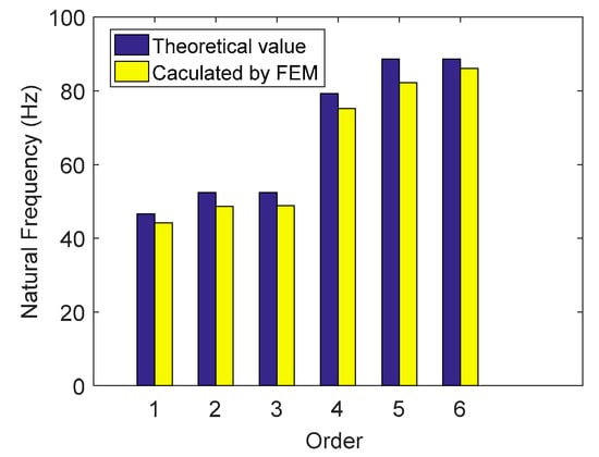 As seen in Figure 11, a certain error exists between the theoretical value and the FEA value; however, it is not large. The theoretical and FEA results of each order’s natural frequency are compared, and the error analysis is shown in Table 3. The maximum error, 7.81%, exists in modal 5, in which vibration mode is the X-rotation. The larger error may be that the coupling effect of the other direction, which is ignored, is slightly affected in the calculation of its stiffness and kinetic energy.
