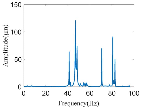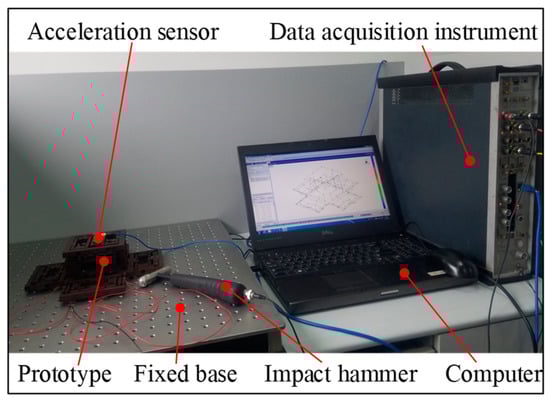 To further verify the natural frequency and identify the modal damping ratio, a modal experiment was performed. The experimental setup is shown in Figure 12. This includes the LMS Test Lab 9A test system (LMS International, Inc., Leuven, Belgium), LMS SCADAS-III (LMS International, Inc., Leuven, Belgium) data acquisition instrument, B&K 4525-B three-way acceleration sensor, and B&K 8206–002−54138 type excitation hammer (LMS International, Inc., Leuven, Belgium). When the test piece is struck by a hammer, the exciting force signal can be measured by a force sensor mounted inside it. The response signal of the platform was measured using a three-way acceleration sensor. Then, the sensor’s data were connected to the data acquisition, and the modal analysis was performed through the data acquisition and analysis system. The experimental results are shown in Figure 13. The peak of magnitude occurred at the natural frequency.