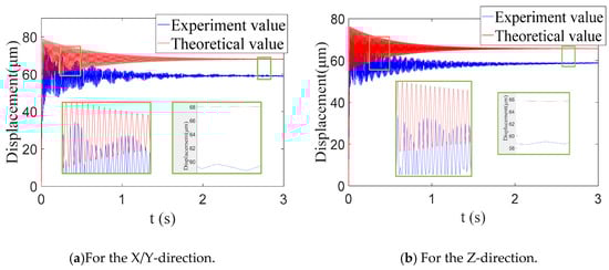 A 10 μm step signal was input to the PZA in the X-direction and the Z-direction. The symmetrical structure was such that the case in the Y direction was the same as that in the X direction; thus, there was no need to do it in the Y direction. Then, the displacement sensor was used to detect the output displacement of the compliant platform to obtain a step response. The step response measured by the test was compared with the theoretical value, as shown in Figure 15. The analytical dynamic model of the input step response was a second-order ordinary differential equation, which was solved by MATLAB using the fourth-order Runge–Kutta method. The allowable error band was taken to be ±2%, depending on the accuracy requirements. The step output displacement Sp and settling time ts of the theory and experiment are all listed in Table 5.