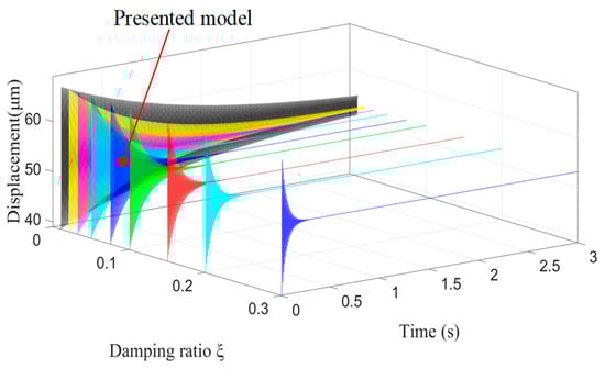 The above results reflect that the value of tp was too large. One of the reasons was the small natural frequency of the device. There was a positive correlation between the natural frequency and stiffness, and the frequency increased when the stiffness increased. Therefore, the response speed can be increased by maximizing its stiffness when designing a compliant platform. Another reason was the small damping of the structure and material of the device. Therefore, the response speed can also be increased by increasing the system damping. The vibration image of the Z-direction varying with the damping ratio is shown in Figure 16. The system settling time varied with the damping ratio, which is consistent with Equation (17) and proves the correctness of the theory.