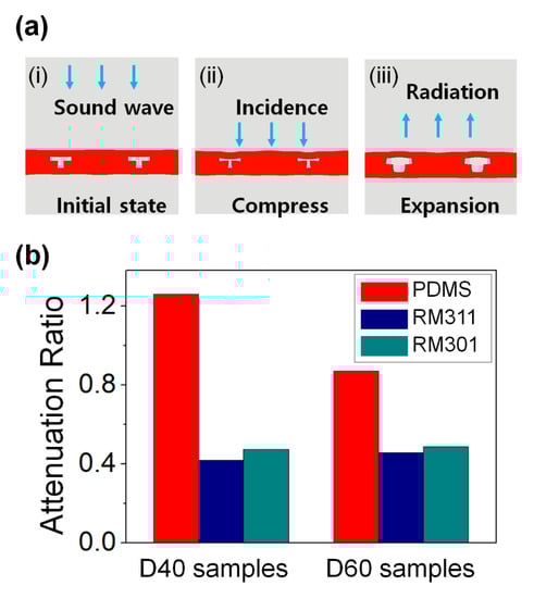 The acoustic attenuation performance of the fabricated acoustic element using various materials was observed. However, unlike an acoustic element composed of soft PDMS, a special attenuation performance did not appear in an acoustic element composed of a relatively hard UV-curable material. As shown in Figure 3a, in the acoustic attenuation mechanism simulation, (i) when a sound wave is applied to a micro-scale acoustic element, (ii) the element contracts by the sound wave, and (iii) radiation by expansion occurs, resulting in an acoustic attenuation effect. The 1.8 MPa as Young’s modulus of material and 1 MHz soundwave were used as initial conditions in simulation. Additionally, the planar wave was incident to the acoustic element and all elements were considered reciprocal and isotropic. PDMS is a silicone-based rubber and is used in various fields due to its low surface energy, high transparency, and high replication performance. The Young’s modulus of PDMS is 1.8 MPa, and its shape can be easily changed according to external stimuli. However, as shown in Table 1, since RM311 and RM301 have a relatively large Young’s modulus of 300 and 150 MPa, respectively, it is difficult to realize sound attenuation with a mechanism such as Figure 3a. To observe the attenuation performance intuitively, by using the ratio of the attenuation rate at 1 MHz and the attenuation rate at 5 MHz, attenuation result according to materials is more clearly indicated (Figure 3b). Through the attenuation ratio between 1 and 5 MHz, attenuation performance could be shown easily. Generally, the attenuation ratio is much less than 1 since the attenuation rate at 5 MHz must be higher than the attenuation rate at 1 MHz. For example, in the non-patterned PDMS case (Figure 2c), the attenuation ratio value was just 0.24. If the sample exhibits good attenuation rate by resonance at 1 MHz, the attenuation ratio would be close to 1. Thus, if acoustic attenuation by resonance occurs, the attenuation ratio would be increased. Therefore, the attenuation ratio means the larger the attenuation ratio, the greater the attenuation. When the diameter of the cavity was 40 μm, the sample made with PDMS showed a high attenuation ratio of 1.26, but the samples made with RM311 and RM301 showed a low ratio of 0.42 and 0.47, respectively. Moreover, when the diameter of the cavity was 60 μm, the sample made with PDMS showed an attenuation ratio of 0.87, whereas the samples made with RM311 and RM301 showed values of 0.46 and 0.49, respectively. In both cases, as in the simulation results, the sample composed of PDMS showed high attenuation performance. Moreover, the attenuation ratio of the RM311 with a higher Young’s modulus was observed to be lower than the attenuation ratio of the RM301 and this could be additional evidence of the simulation result.