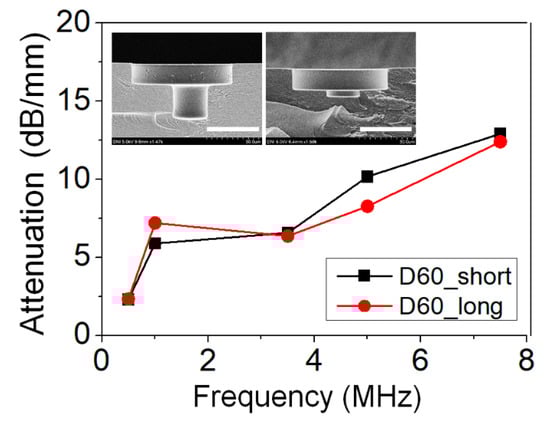 In addition, in order to find out the difference in acoustic attenuation performance according to the size of the neck, a sample with a cavity volume of 60 μm in diameter and a different height of the neck was made in order to perform acoustic attenuation experiments. The attenuation test was conducted using samples with a neck length of 11.5 μm and a sample of 3.6 μm, whose SEM images are shown in Figure 4. As a result, the acoustic attenuation characteristics were very poor in the case of the sample with the short neck length. This is because the air in the neck and the cavity interacts and compresses and expands. When the acoustic element contracts by soundwaves, the air pressure in the neck and cavity changes instantaneously due to the difference in the cross-sectional area of the neck and cavity of the acoustic element, and contraction occurs, and accordingly, radiation occurs with a greater pressure. However, when the length of the neck is short, there is not enough air in the neck for this mechanism to occur, and the acoustic attenuation rate decreases. Moreover, this is more clearly exhibited by using the attenuation ratio. When expressed as the ratio of the attenuation rate at 1 MHz and the attenuation rate at 5 MHz, the attenuation ratio of the long neck and the short case was 0.87 and 0.58, respectively. In samples with a neck length of 11.5 μm, the attenuation ratio was shown to be 1.5 times higher than the sample of the 3.6 μm case. Through this experiment, it was found that the length of the neck has an important effect on the acoustic attenuation performance.