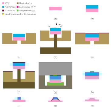 The complete process flow proposed in this work for the fabrication of high refractive index contrast waveguides in KY(WO4)2 is shown in Figure 1. The main innovations introduced by this work are shown in steps c–g and in k. Steps c–f show our approach to the spin coating process using thick photoresist on small samples, in this case 1 cm2, with minimal edge bead. Step g shows a tool used during the exposure step to reduce risk of sample cracking during UV contact lithography. Furthermore, redeposited material from the inductively coupled plasma reactive ion etching (ICP-RIE) process is removed from the sidewalls of the feature using a selective wet etch (Figure 1k). The KY(WO4)2 samples used in this work are purchased from Altechna, LT. They have a size of 10 mm × 10 mm × 1 mm. In the following sections, the different steps of the described process flow are detailed.