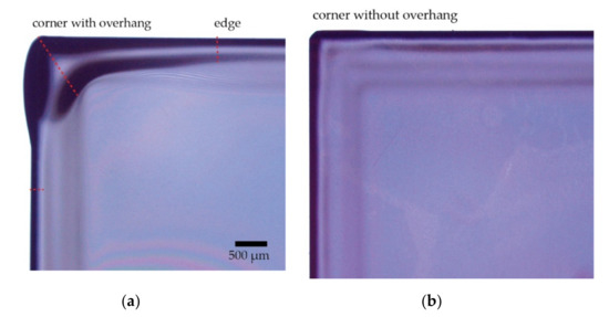 The full potential of the technique is shown in the row “Chuck 2 filtered” of Table 1, where only the corners that were in contact with the chuck were considered for the analysis. These data points show a 22% smaller width of the edge bead than obtained when using chuck 1 and 57% narrower corners, not accounting for uncertainty. It can also be clearly observed in Figure 3 that the overhang visible when using the original chuck disappears with the improved chuck.