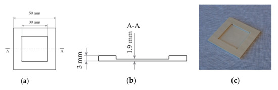 In this work, a sample mount is designed and manufactured, as shown schematically in Figure 4a,b and photographed in Figure 4c. The mount consists of a 3-mm thick square of width and length 50 mm × 50 mm, with a 1.9-mm deep blind hole of 30 mm × 30 mm in the middle. The mount is made from polyether ether ketone (PEEK) plastic due to its good properties for high-precision machining.