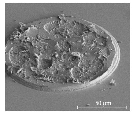 One challenge of deep Ar etching is reticulation of the thick photoresist layer [26]. It is commonly observed that when the resist is etched for a long time by using argon, surface cracking, bubbling, and chemical hardening can occur. Such defects cause severe roughness, as well as craters in the sample where the resist has cracked, and they make resist removal challenging. An example is shown in Figure 5, where a disk of 120 µm in diameter in a 3.5-µm thick Olin OiR 908-35 photoresist was subjected to 30 min of argon plasma etching. Furthermore, the hardened resist may be challenging to remove using oxygen ashing or stripping in HNO3. While it may be assumed that hard-baking or UV curing, which are known to increase the chemical resistance of photoresist [34], would diminish the risk of reticulation, we observed the opposite effect in our experiments. Therefore, such hardening processes are not recommended for Ar etching.