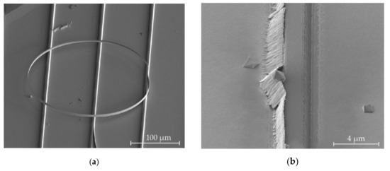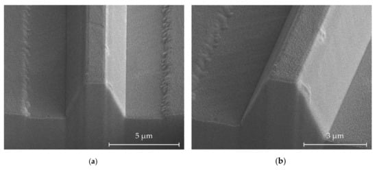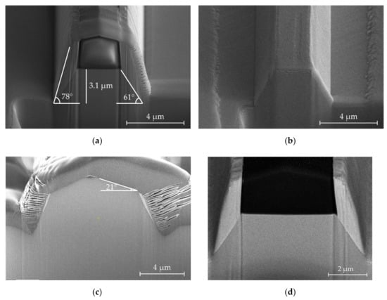 The resulting structure using a SiO2 hard mask and the etching recipe discussed above is shown in Figure 6a,b. The etch depth is 3.1 µm. The sidewall angle is 78°, while the measured angle of the structure within the redeposition is 61°.