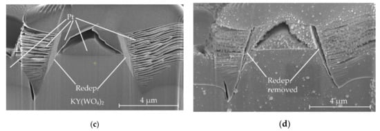 Figure 6d shows a similar structure, imaged with an Everhart–Thornley detector with a negative bias voltage. This configuration repels secondary electrons and detects only backscattered electrons. The backscattered electron yield is strongly dependent on elemental composition, with heavier atoms having a higher yield and appearing brighter [42,43]. The redeposition is much brighter than the crystalline KY(WO4)2. This indicates that it is not simply an amorphous phase of KY(WO4)2, but rather a stoichiometrically different compound.