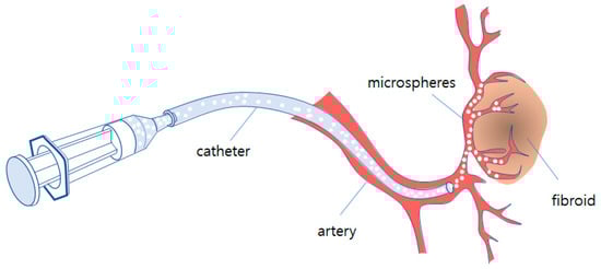 Embolization is one of interventions carried out by the micro-invasive procedure using imaging equipment. A catheter is inserted to the correct vessel by digital subtraction angiography and organ positions. The artificial embolus microspheres are guided to block capillary vessels through which the myoma receives nutrients from the blood. This procedure is simpler and easier than other surgical methods and also has fewer treatment-related events. Figure 1 shows the schematic of fibroid embolization of microspheres with the catheter.