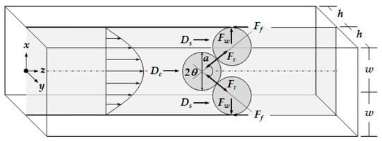 Because the open area to two microspheres is (), the position of their average velocity does not coincide with the geometric center of the microspheres. The position of the average velocity of the microsphere on the wall is obtained by dividing the flow rate with the open area, as shown in Equation (6).