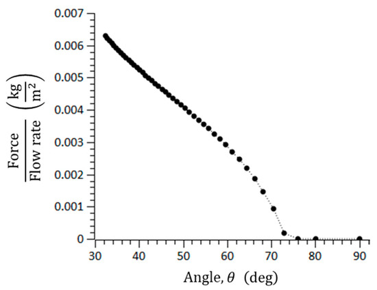 where is the coefficient of the static friction. In general, the static friction is larger than the dynamic friction. The three important forces to form the blockage arching of microspheres in the catheter channel were calculated. For = 0.7, = 100–145 μm, = 150 μm, = 2.5, and = 1.12 × 10−3 N/m∙s, the blockage arching angle was analyzed. If the summation of drag forces is smaller than the friction force, it is possible for a blockage to occur. Figure 4 shows the blockage arching angle, and it was determined to be over 76°, approximately. In addition, the blockage angle depends on the material of the microspheres because the coefficient of the static friction differs by material.