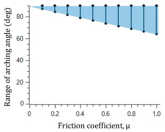 In the visualization, the microsphere blockage occurred at an arching angle of 70° in the straight catheter channel without the convex air bubbles, while the microspheres moved freely in the straight catheter channel with the convex air bubbles, despite a geometrical arching angle of over 85° being formed. To explain the slip effect of the convex air bubble on the prevention of the microsphere blockage, the possible range of the blockage arching angle was calculated for the different friction coefficients. Figure 5 shows that the range of the blockage arching angle also decreases as the friction coefficient decreases. As a result, it is concluded that the slip effect on the convex air bubble can reduce the friction and can prevent the blockage by the arching of the microspheres in the catheter channel.