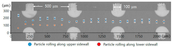 Figure 6 visualizes two trajectories of the microspheres moving around the upper and lower convex air bubbles attached in the straight microchannel. They were obtained by averaging the movements of five different microspheres. The microspheres gradually moved to the middle of the channel by passing through the convex air bubbles. Near the fourth convex air bubble in the flow direction, the drift distances of the upper and lower microspheres from their initial positions were measured to be 238 and 166.8 μm, respectively. Additionally, their drift distances away from their initial positions were analyzed for two different sizes of convex air bubbles. The channel width was 400 μm, and the interval of the convex air bubbles was 500 μm. Figure 7 plots the positions of the microspheres passing around the upper and lower convex air bubbles with a height of 60 (blue asterisk) and 102 μm (red diamond), respectively. When the microspheres passed the convex air bubbles with a height of 60 μm, they moved 64.6, 77.7, 102.9, and 134.7 μm upward gradually from their initial positions and converged to the center of the catheter channel. Moreover, for a bubble height of 102 μm, they drifted 103.9, 105.6, 102.2, and 108.8 μm, sequentially. The microspheres passing around the convex air bubbles drifted rapidly due to a large centrifugal acceleration that is inversely linear to the bubbles small radius of curvature. After they were placed away from the convex air bubbles, their drift distance was decreased because the centrifugal effect became weakened.