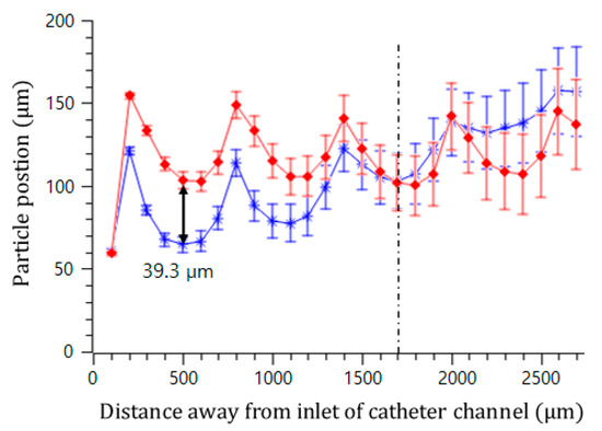 Trajectory of microsphere movement in the catheter channel with a bubble height of 102 μm (red diamond) and a bubble height of 60 μm (blue asterisk).