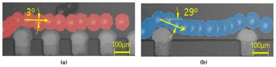 The two straight microchannels with and without the air bubbles were compared. The channel width was 200 μm. The inlet flow rate was 257.1 μL/min, corresponding to an Re of 20. In the straight microchannel without the air bubbles, blockage occurred. It was hard to control the exact condition and position of the blockage occurrence. Only after the blockage occurred were its characteristics measured. Figure 2a shows a picture taken after the blockage occurred in the catheter channel without the air bubbles. Its angle was obtained from the line connecting the centers of the two microspheres and the channel length. The blockage arching angle was obtained at an angle of about 70° from the image analysis, similar to one theoretically obtained. However, it does not mean that the measured blockage angle of 70° is a threshold or minimal angle.