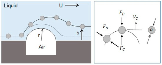 This centrifugal force enables the microsphere to escape from the surface of the air bubble in its normal direction. The drag force resists against the movement of the microsphere in the normal direction. It can be obtained by the Stokes force where Vs is the drift velocity in the normal direction.