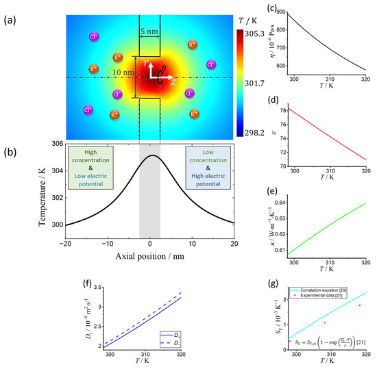 (a) Schematic illustration of a (in diameter) nanopore separating two KCl solutions with different concentrations. The concentration of the solution on the left side of the reservoir is higher than that on the right side, whereas the electric potential on the right side is higher than that on the left side. The temperature inside the nanopore has a significant increase due to Joule heating effects. (b) Typical axial temperature distribution in an ultrathin nanopore with Joule heating effects. (The shaded part indicates the position of the nanopore.) Relations between the (c) viscosity of pure water, (d) static dielectric constant , and (e) thermal conductivity and temperature at . Temperature responses of the (f) diffusivity , and (g) Soret coefficient of aqueous KCl, where the subscript of “” denotes the cation and anion , respectively.