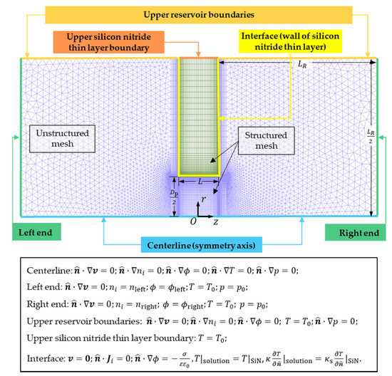 Continuum dynamics can describe the transport phenomena of ions in nanofluidic channels when the length scale is above [27]. The previous results of molecular dynamics show that the temperature gradient is continuous in the liquid phase at the quasi-atomic scale [28,29], thus verifying the continuous assumption including the temperature field inside our system. On this account, we solve the governing equations by numerical simulation, which is discretized in an implicit finite volume formulation [30] on a hybrid mesh consisting of structured and unstructured grids. The length of the reservoir in the computational domain is , which can provide sufficiently accurate results that are not sensitive to the size of the reservoir and remain computationally efficient. Even if is increased to with a larger computational domain and more and denser mesh grids, the relative difference of the simulation results between these two cases is smaller than 2.5% (detailed information is provided in the Supplementary Materials Section S1). The total cell number of the mesh is 149,004, including 100,086 unstructured triangles and 48,918 structured quadrangles.