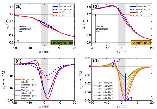 We compared TIC phenomena in four different cases: (i) An uncharged pore without Joule heating, (ii) an uncharged pore with Joule heating, (iii) a negatively charged pore without Joule heating, and (iv) a negatively charged pore with Joule heating. In all cases, a solution concentration difference of and an electric potential difference of are applied across a (diameter) nanopore. When Joule heating is considered, the ionic concentrations become slightly lower in the nanopore as shown in Figure 3a,b. As the surface charge exists, the imbalance of the salt concentration becomes more significant due to ICP effects [6]. Figure 3c shows the ionic concentration difference (proportional to the TIC concentration) along the centerline. Except for Case (i), where the TIC is nearly symmetric to the center of the nanopore, positive TIC is induced at the entrance of the nanopore, opposite to the negative TIC inside the nanopore, although the positive TIC concentration is rather low for Case (iii), at . Note that when Joule heating or surface charge is present, this asymmetry becomes more prominent. The positive TIC reaches a maximum when both the surface charge and Joule heating effects are considered. As shown in Figure 3d, when the surface charge is increased, the amount of both the positive and negative TIC increases.