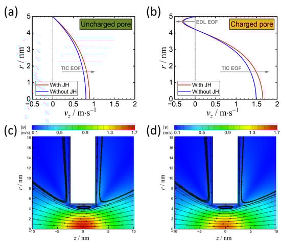 As seen in Figure 5a, we compare the EOF in the cases with and without Joule heating effects in an uncharged nanopore that demonstrates the enhancement of EOF (by ) due to the increase in temperature. This EOF acceleration is primarily attributed to the decrease in viscosity (Figure 1c) and the enhancement of TIC concentration (Figure 3c). Although the induction of positive TIC has negative effects on the increase in EOF, the increment of negative TIC is more significant and therefore dominates the EOF behavior. Similarly, as the nanopore is negatively charged (Figure 5b), the EOF due to the surface charge in the vicinity of the nanopore surface also increases, despite the enhancement of TIC effects that drive the solution toward the opposite direction in the middle of the nanopore. The presence of these two types of EOF generates a vortex near the outer boundary of the electric double layer, as shown in Figure 5c,d.
