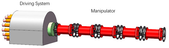 The overall mechanical structure of the UCDM proposed in this article is shown in Figure 1. It consists of a driving system and a cable-driven manipulator. The driving system includes cables and motors mounted on the base. The manipulator is composed of five arm sections with embedded BRS. Adjacent sections are coupled by cross universal joints. According to task requirements, the manipulator can expand the number of sections to improve its adaptability in operations. Considering the need of self-weight reduction and rust prevention, 6061 aluminum alloy is selected as the main material of the UCDM. The specifications of the manipulator are shown in Table 1.