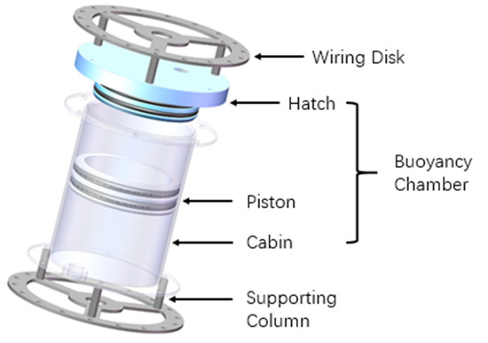 As shown in Figure 2, an arm section consists of two wiring disks, six supporting columns, and a buoyancy chamber. The buoyancy chamber mainly consists of a cabin, a hatch, a piston, two nozzles and several sealing rings. The piston separates liquid and gas, so the buoyancy can be adjusted by a fluid power system, which changes the proportion of liquid and gas in the chamber. Each two adjacent sections are connected by a universal joint fixed on wiring disks by nuts, so that each joint has a rotation range of ±30° in two degrees of freedom (DOFs) of movement.