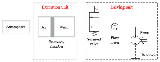 The BRS of each section is composed of micro pump, flow meter, solenoid valve and connecting pipelines. Its working principle is shown in Figure 3. The liquid medium in the buoyancy chamber is water, and the gas medium is air. The buoyancy of each section is adjusted by changing the volume of water in the chamber by the pump control system. The driving unit of the BRS is installed on the base, connected to the execution unit through pipelines. This avoids the waterproof problem of the electrical system and simplifies the structure’s design.
