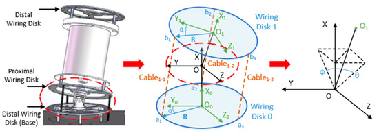 Assuming that the UCDM has n sections in total, αi,j represents the cable deflection angle of the j-th cable that controls the i-th joint (i = 1, 2, 3,..., n; j = 1, 2, 3). Each section is controlled by 3 cables, and their cable deflection angles differ by 2π/3. Assuming that each disk has s wiring holes evenly distributed in the circumferential direction, let , then we have: