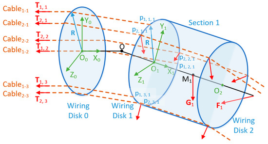 Assuming that the wiring disk 2k − 2 is a fixed wiring disk (as shown in Figure 5, taking the base disk as an example, k = 1), its coordinate system is the ground coordinate system. Define UCDM’s end close to the base as the proximal end, and the end away from the base as the distal end. Then in Figure 5, the wiring disk 2k − 1 is the proximal wiring disk of section k, and the wiring disk 2k is the distal wiring disk of section k. After analysis, the forces on section k include the following: