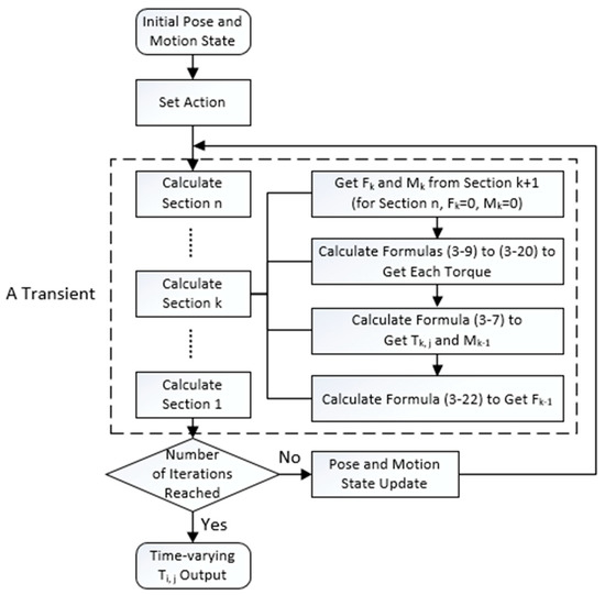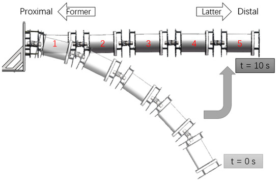 In this section, we numerically solve the dynamic model of the UCDM prototype, as shown in Figure 6. We discretize the motion into multiple transients, and each transient solves the current parameters based on the parameters preset and obtained from the previous transient (the preset parameters mainly include angular acceleration and piston moving speed, and the solved parameters in each transient mainly include angular velocity, pose, and tension). For each transient, the program calculates section by section from the distal end to the proximal end. In the calculation process, Fk−1 and Mk−1 of each section are used as −Fk and −Mk of the former section. Hence, we can simulate the motion of UCDM and obtain the time histories of all cable tensions during the motion.