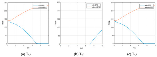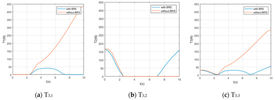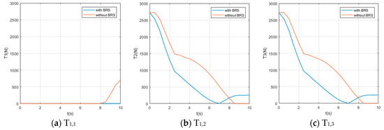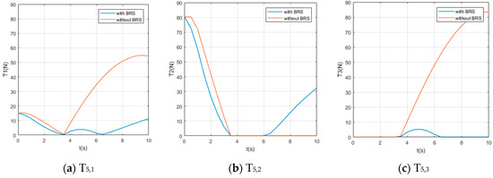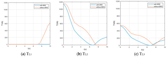 We also assume the movement starts and ends with 0 velocity and a certain acceleration (in order to start or stop the manipulator’s movement). While the manipulator is moving, each section pumps out the water in the buoyancy chamber at a constant speed , providing buoyancy to help the manipulator lift the object. For comparison, perform the same movement on the same manipulator (but without BRS). The Reynolds number , so the drag coefficient . The acting time of the movement is 10s and the step length of the solution is (small enough to show the characteristics of tension). Solution results of the tension on each cable are shown in Figure 8, Figure 9, Figure 10, Figure 11 and Figure 12.