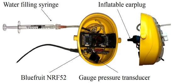 The mobile in-ear power sensor device is composed of a pair of earmuffs; that is, a headband that fits over the head supporting two instrumented cups at each end. The right cup consists of a pre-installed inflatable earplug with three levels of earcanal penetration: short, medium and long. The earplug is inflated with water using a hydraulic circuit including tubes, valves and a pressure sensor, all fitted inside the right cup as shown in Figure 1. This cup also contains electronic circuits for pressure signal conditioning, amplification and data transfer. Water is injected into the hydraulic circuit using a syringe, through the input check valve and the signals are transmitted to the data acquisition and recording system through wires coming out of the cup.